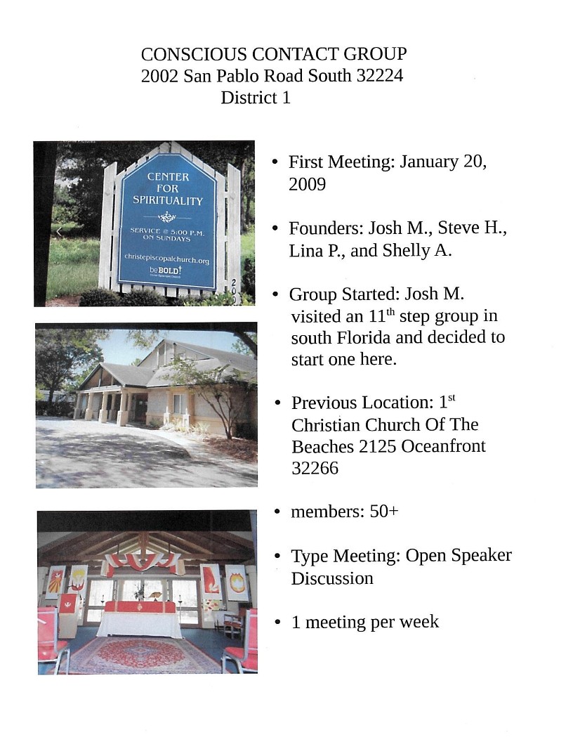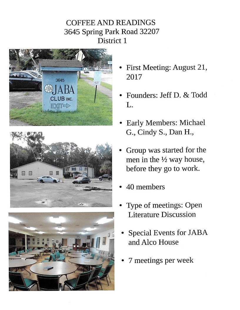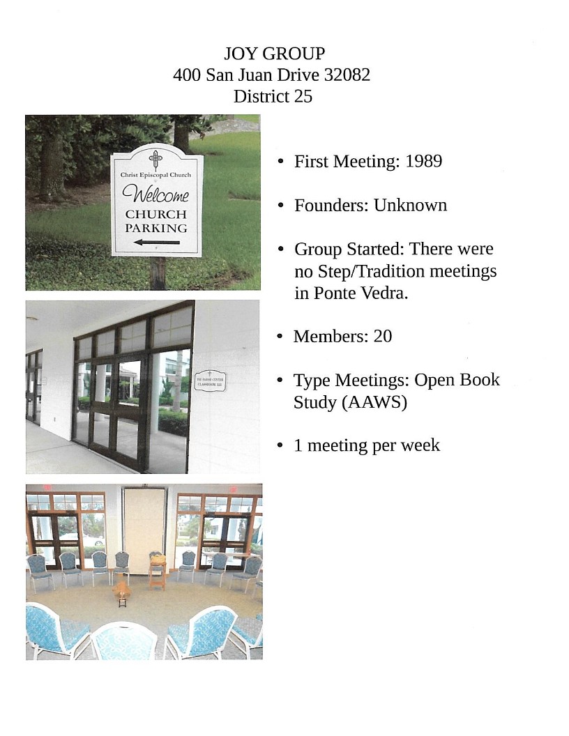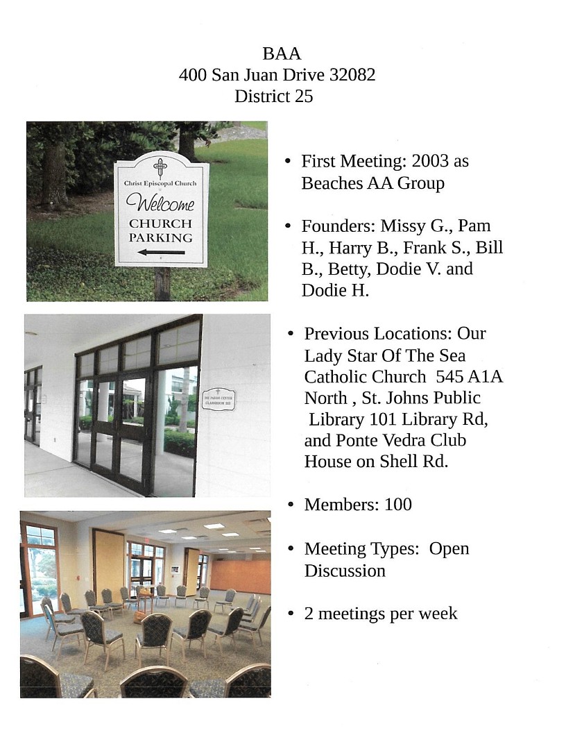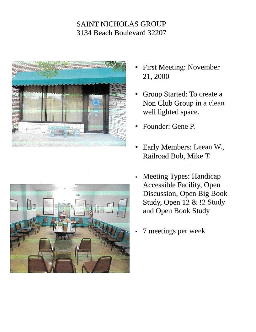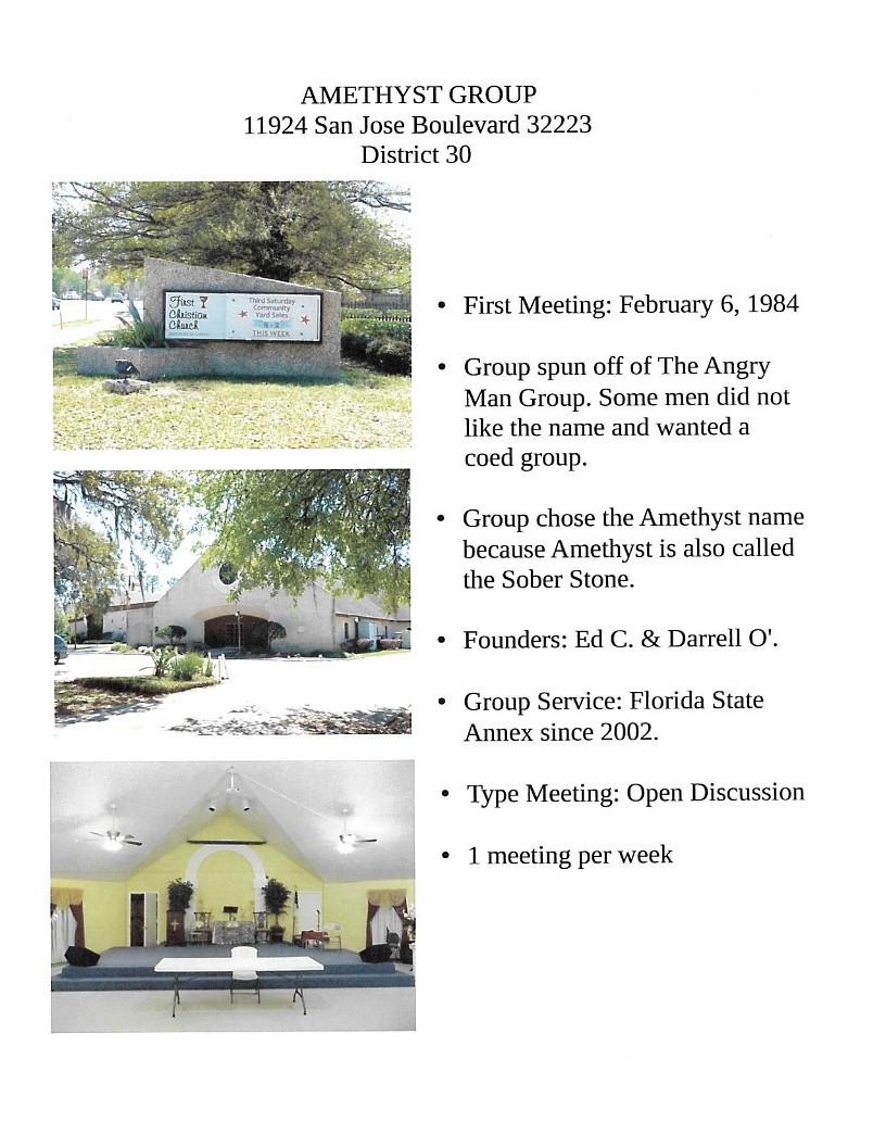 Northeast Florida Intergroup Services, Inc.’s primary purpose is to assist the A.A. Groups in Jacksonville and the surrounding areas in carrying the message of Alcoholics Anonymous to those who still suffer from alcoholism. The Northeast Florida Intergroup Services, Inc. is responsible to the Member Groups from the eight service districts (1, 2, 3, 4, 6, 24, 25, and 30) deriving its legitimate authority from there. In all its activities, policies, and proceedings, Northeast Florida Intergroup Services, Inc. shall observe the practice and spirit of A.A.’s Twelve Traditions and Twelve Concepts for World Service, as well as its Three Legacies of Recovery, Unity, and Service.
